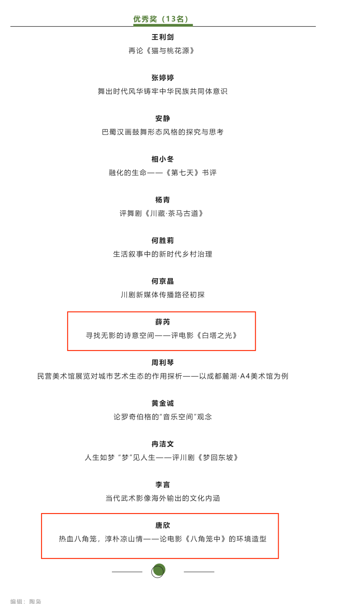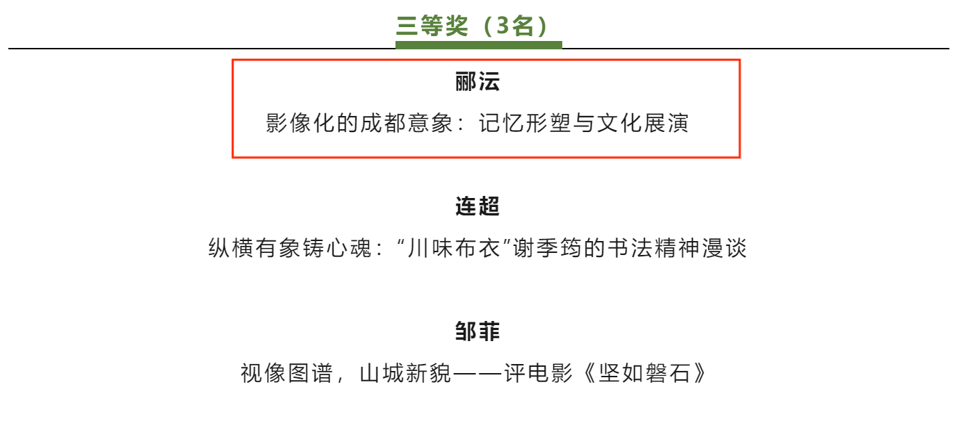 2023年12月14日,由成都市文艺评论家协会主办的2023年“艺评成都”征文比赛结果公布,我院副教授陈洁丽云(笔名:郦沄)的评论作品《影像化的成都意象:记忆形塑与文化展演》荣获三等奖,薛芮老师评论作品《寻找无影的诗意空间——评电影<白塔之光>》获得优秀奖,2022级广播电视编导本科专业学生唐欣评论作品《热血八角笼,淳朴凉山情——论电影<八角笼中>的环境造型》荣获得了优秀奖。