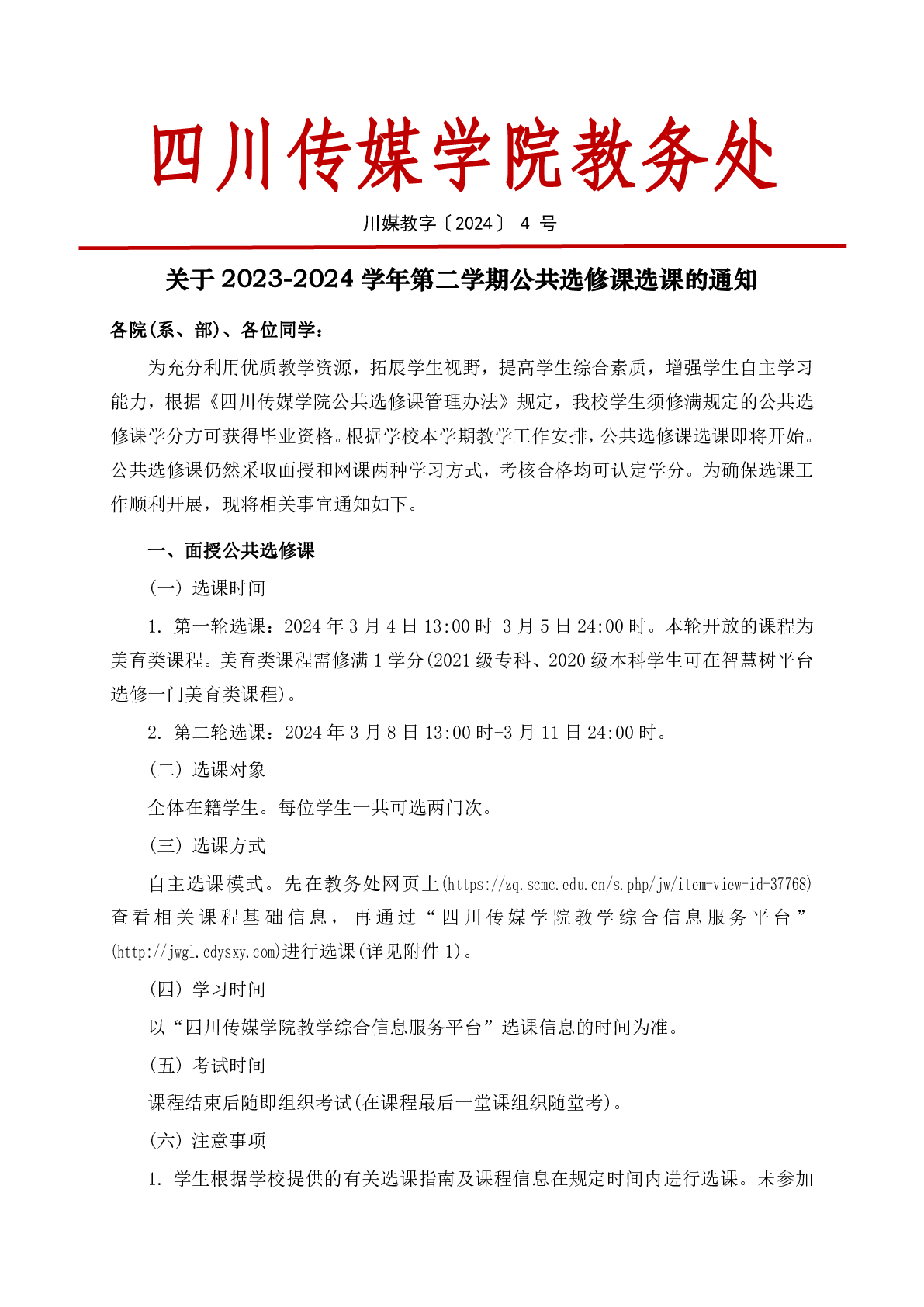 四川传媒学院教务处关于2023-2024学年第二学期公共选修课选课的通知