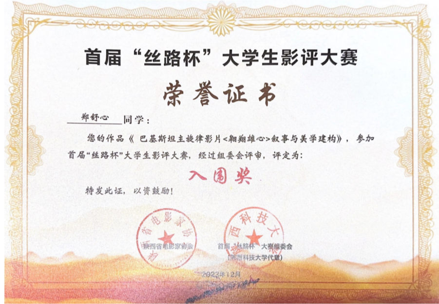 2024年3月12日,由中国高等院校影视学会影视评论专业委员会、陕西科技大学、陕西省电影家协会联合主办的第一届“丝路杯”全国大学生影评大赛颁发了获奖证书,由我院鄢佩老师指导,2021级广播电视编导专业学生郑舒心影评《巴基斯坦主旋律影片<翱翔雄心>叙事与美学建构》获得本科生组入围奖,四川传媒学院获优秀组织奖。