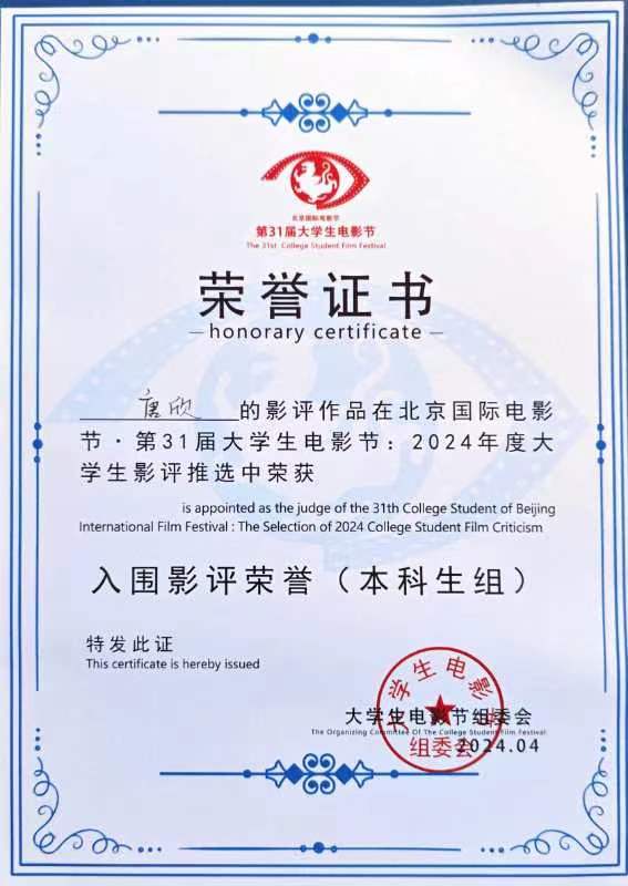 四川传媒学院编导艺术学院学生影评入围北京国际电影节·第31届大学生电影节影评推选