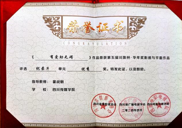 近日,由四川省摄影家协会作为学术指导单位,四川省广播电视学会和四川电影电视学院联合主办,川影电视学院和西北政法大学新闻传播学院(艺术学院)联合承办的第五届川影杯华年奖落下帷幕。由我院广播电视编导专业教师霍战朝指导,2022级广播电视编导专业学生邓羽含、曹嘉馨、徐多、孙文贤、马于钊同学创作的纪录片《有爱助无碍》获得优秀奖,四川传媒学院获得优秀组织奖。