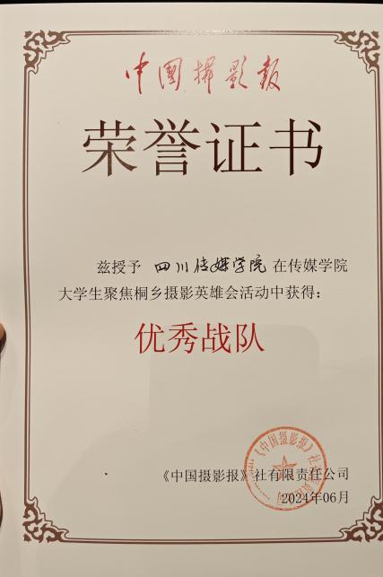 2024年6月7-11日,四川传媒学院摄影学院受邀参加浙江嘉兴桐乡举办的“五大传媒学院聚焦桐乡英雄会”活动。摄影学院教师何博带队,2021级摄影本科学生杨昊睿、杨逍、邵兴源、戎义丞作为学生团队参赛。最终,杨逍凭借作品《水映洲泉》获得“超级英雄”个人金奖荣誉,获得创作经费5000元;四川传媒学院获得“优秀战队”称号。