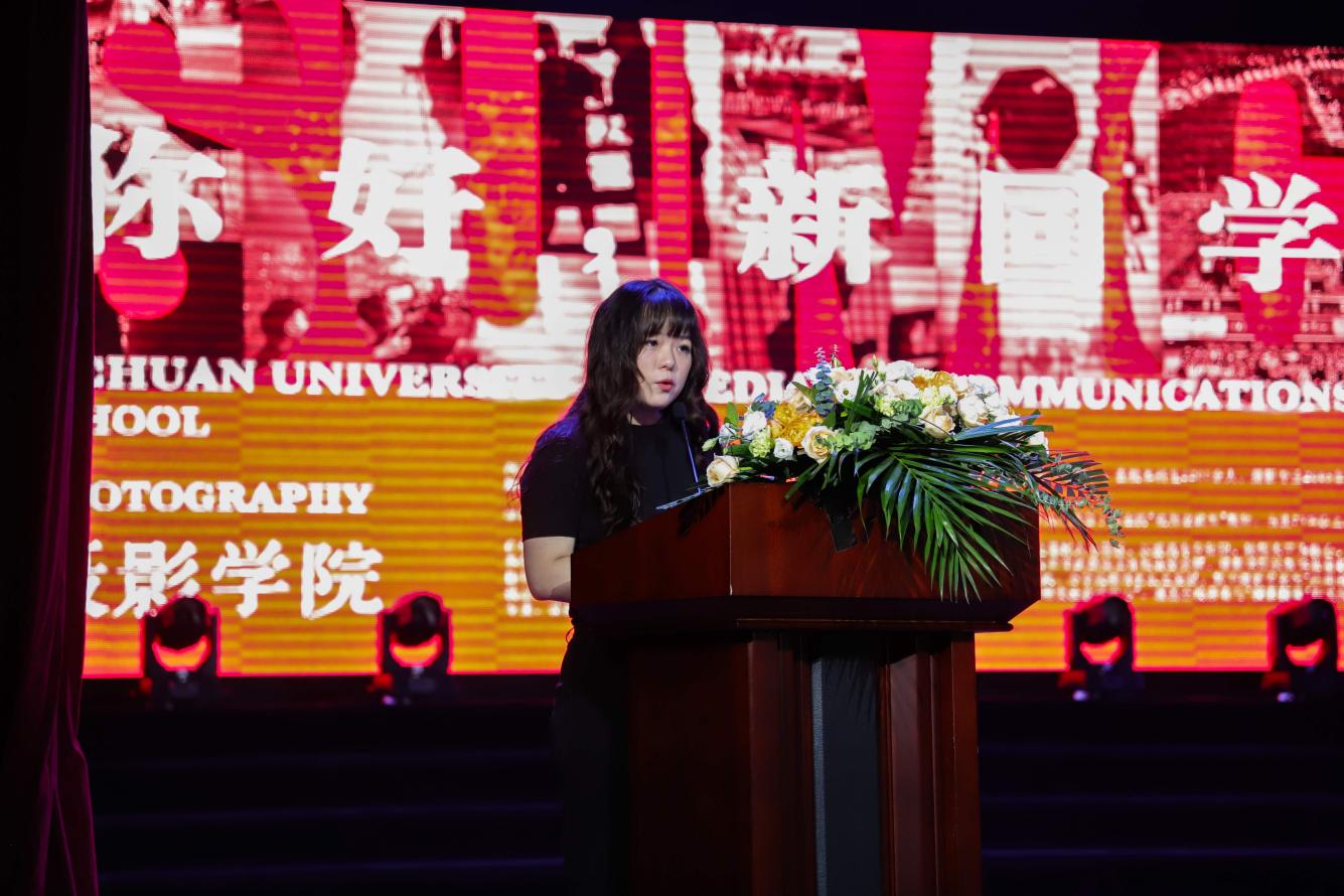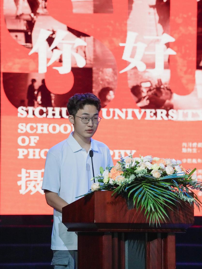 2024级影视摄影与制作专业本科5班侯思宇同学作为新生代表发言。他表达了对摄影学院的期待和热情,共同开启新的学习旅程,携手同行,共赴未来。