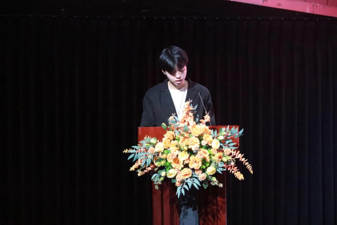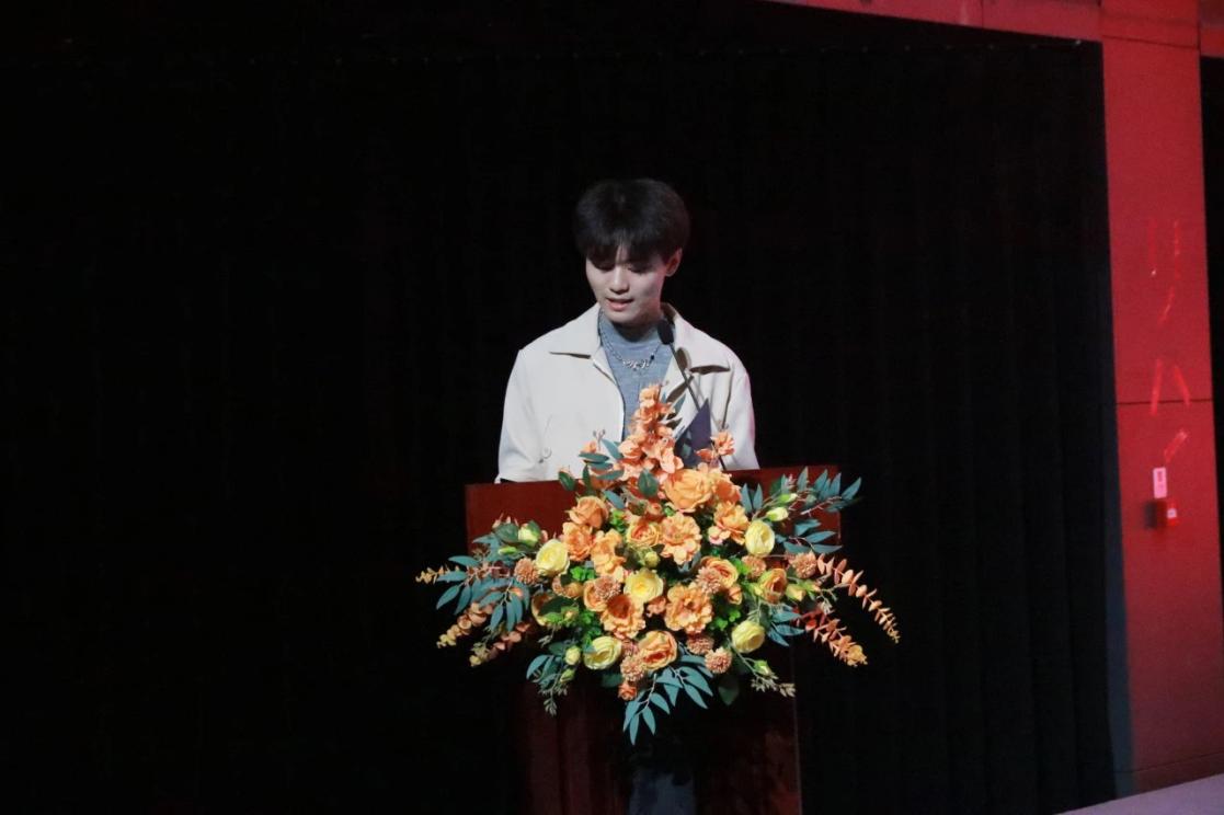第四环节:2023级新晋学生干部代表郑力嘉发言,他回顾了过去一年里在团学中参与过的工作,与大家分享他的收获,同时他也给新一届学生干部提出建议,希望他们能兼顾好学业与团学工作,严于律己,为大家树立榜样作用。