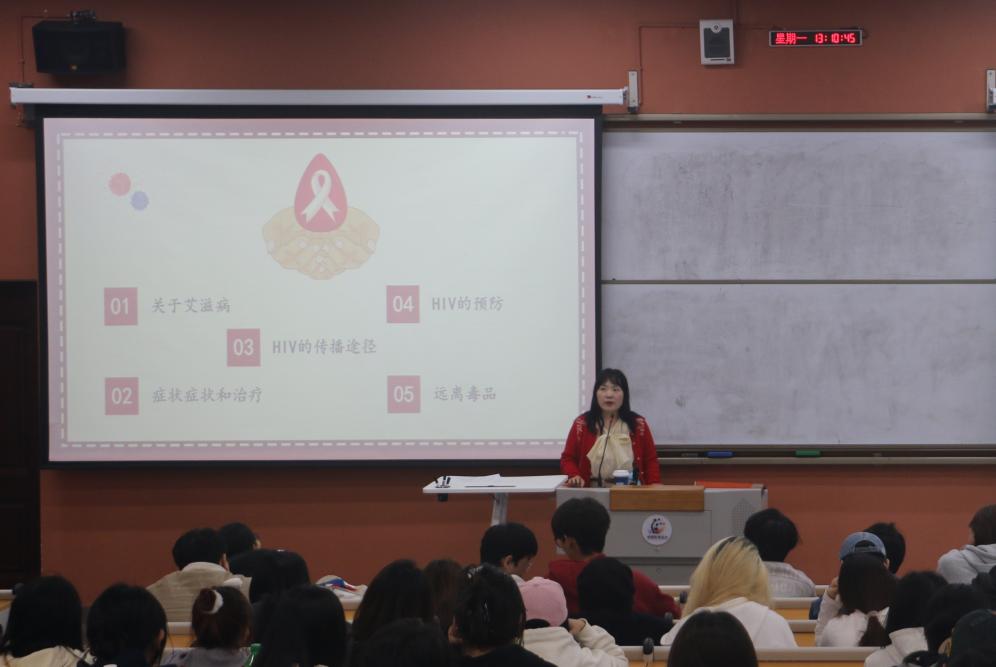开讲伊始,贺莉娅副书记首先向同学们介绍了艾滋病的基本概念,并指出艾滋病是一种危害极大的传染病,由人类免疫缺陷病毒(HIV)引起,严重威胁人类的健康和生命。她重点解读了我国艾滋病“国八条”内容,强调重在预防、早期发现并阻断治疗的重要性。针对HIV的传播途径,她还用与同学们互动的方式进行了生动的深入讲解,同时分享了预防HIV的方法。