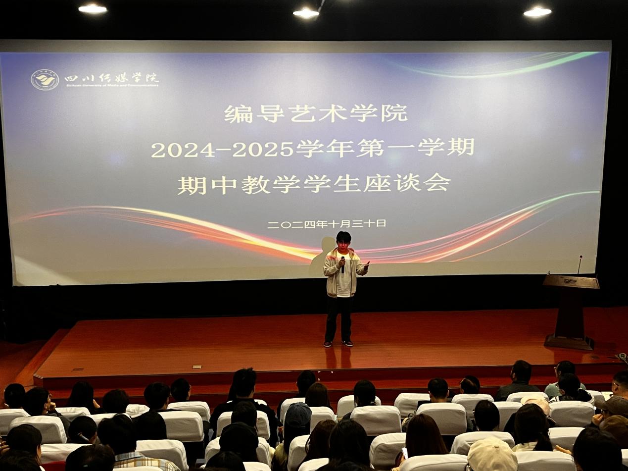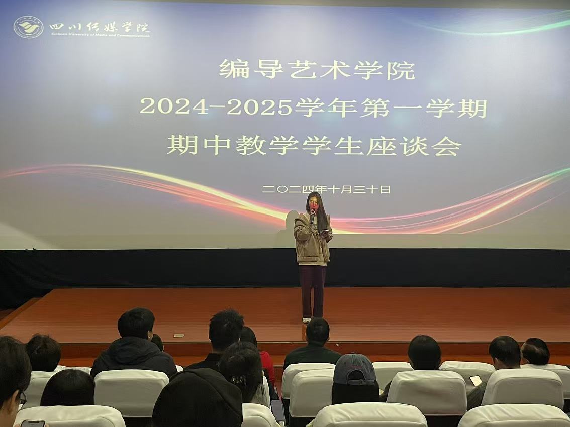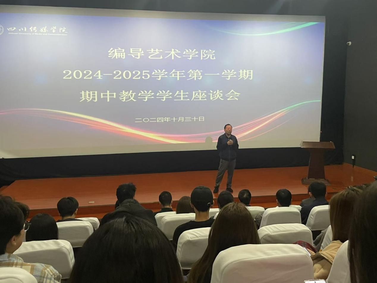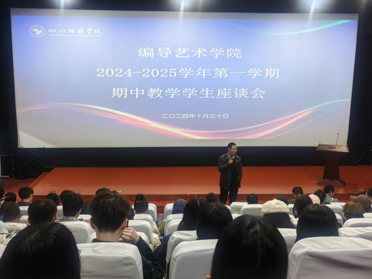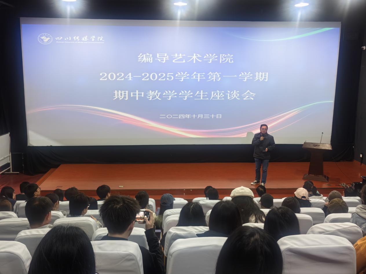 2024年10月30日18:30,编导艺术学院在东区A17-110组织举行了2024-2025学年第一学期期中教学检查学生座谈会。教务处教学运行科科长张作舟带领学校期中教学检查组第十工作组到场检查、指导。四川传媒学院校长助理、编导艺术学院院长熊志冲,党委书记王禹明,副院长吴建、王雪梅、张志斌,艺术总监张乐平,党委副书记贺莉娅,各教研室负责人及2022-2024级学生代表与会。熊志冲院长讲话,强调了期中教学学生座谈会作为评教反馈机制的重要性,并鼓励学生代表积极主动、客观真实地反映学院的教学和管理工作情况。