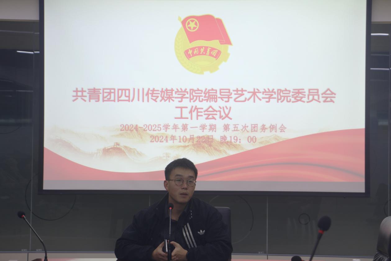 2024年10月22日晚19:00,共青团四川传媒学院编导艺术学院委员会2024 —2025学年第一学期第五次团务例会在2A6 - 309召开。团委书记何秋坤及大一学生干部、大二、大三负责人出席了此次会议。