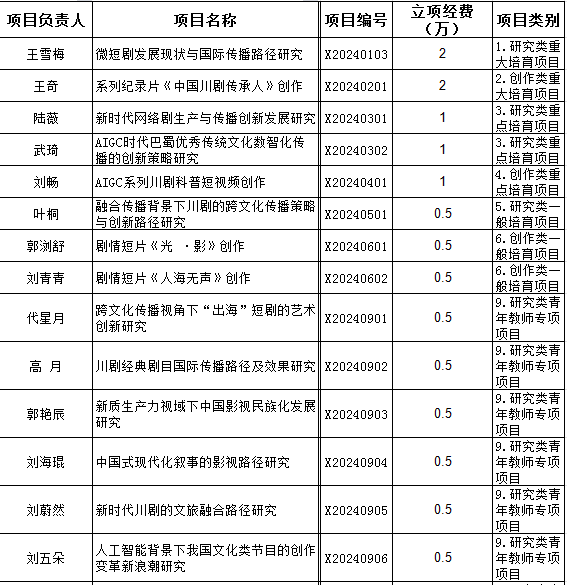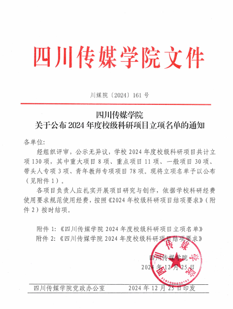 2024年12月25日,四川传媒学院公布了2024年度校级科研项目立项名单,我院教师申报的19个项目获批立项,其中包括重大项目2项,重点项目3项,一般项目3项,青年教师项目11项。此次立项项目覆盖了数智生产、非遗传承、对外传播等多个议题,有助于提升教师的科研创新能力。
