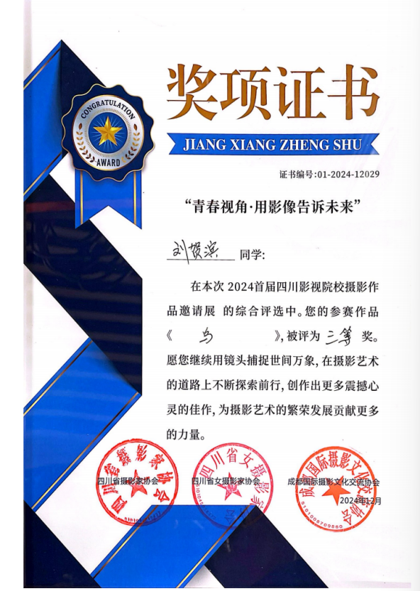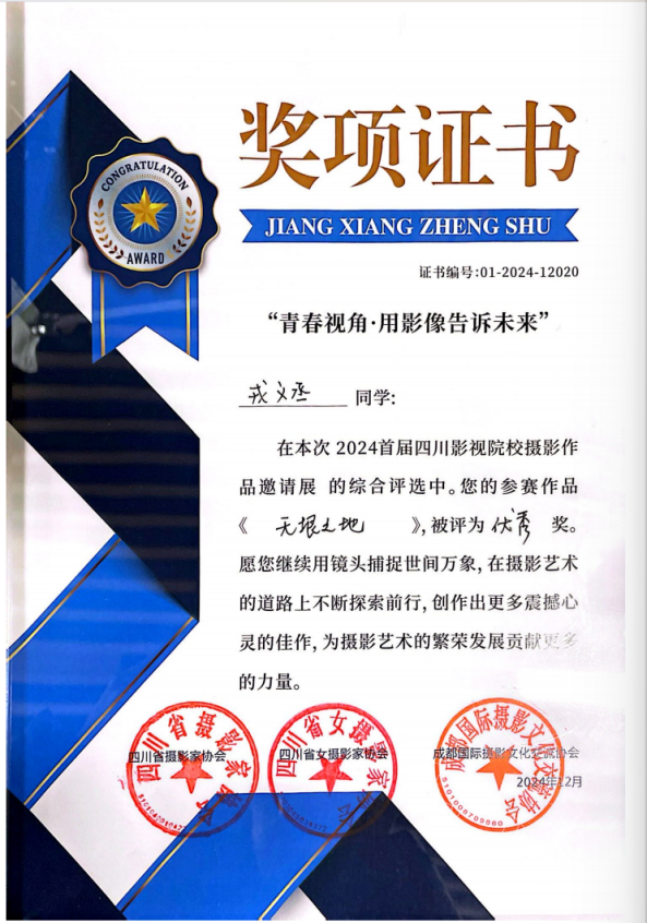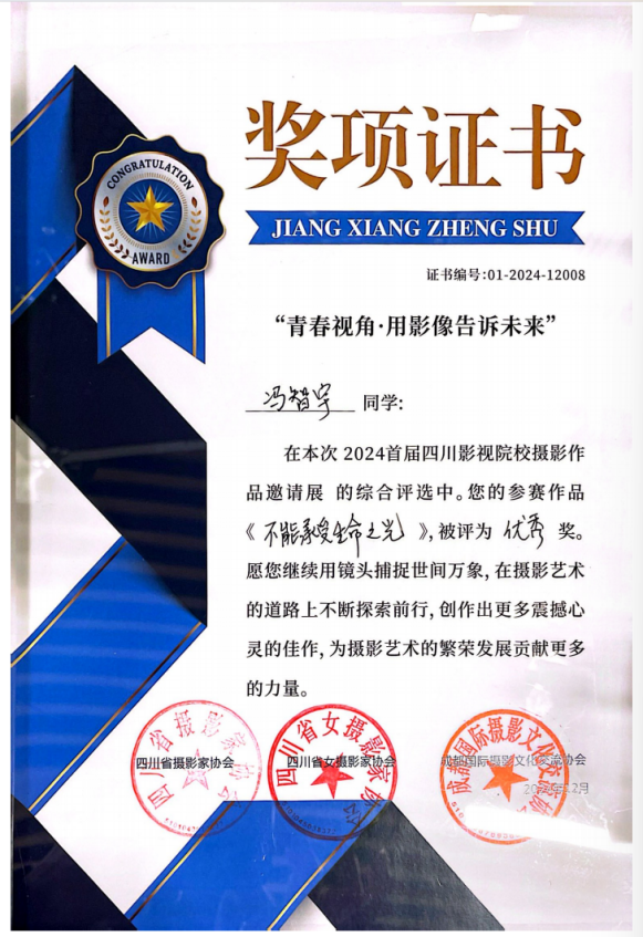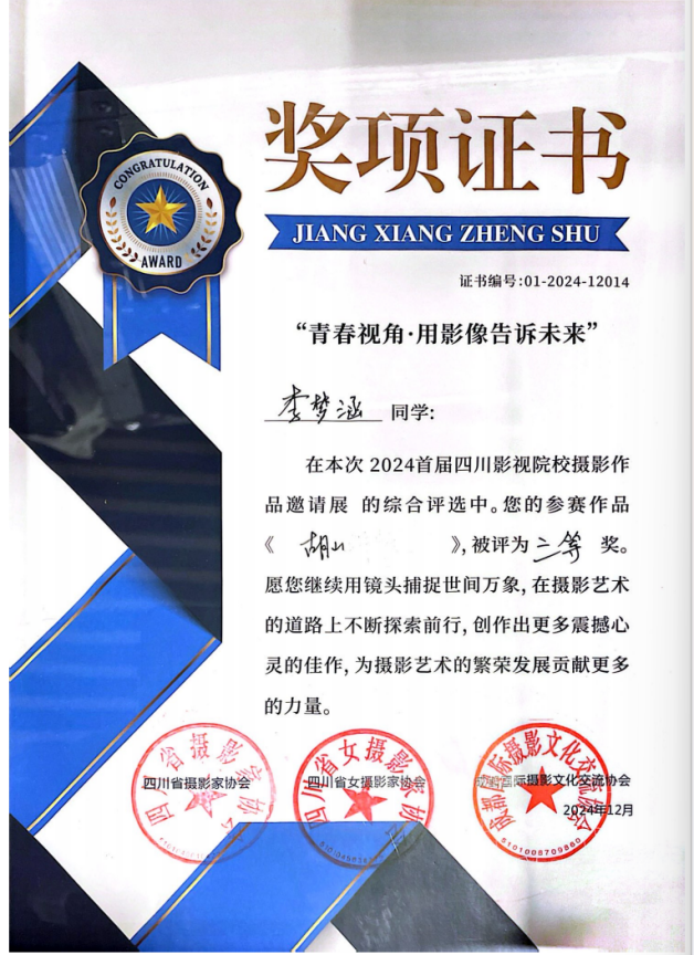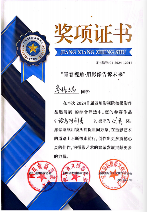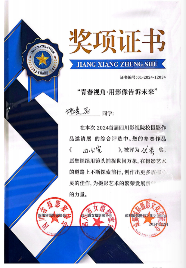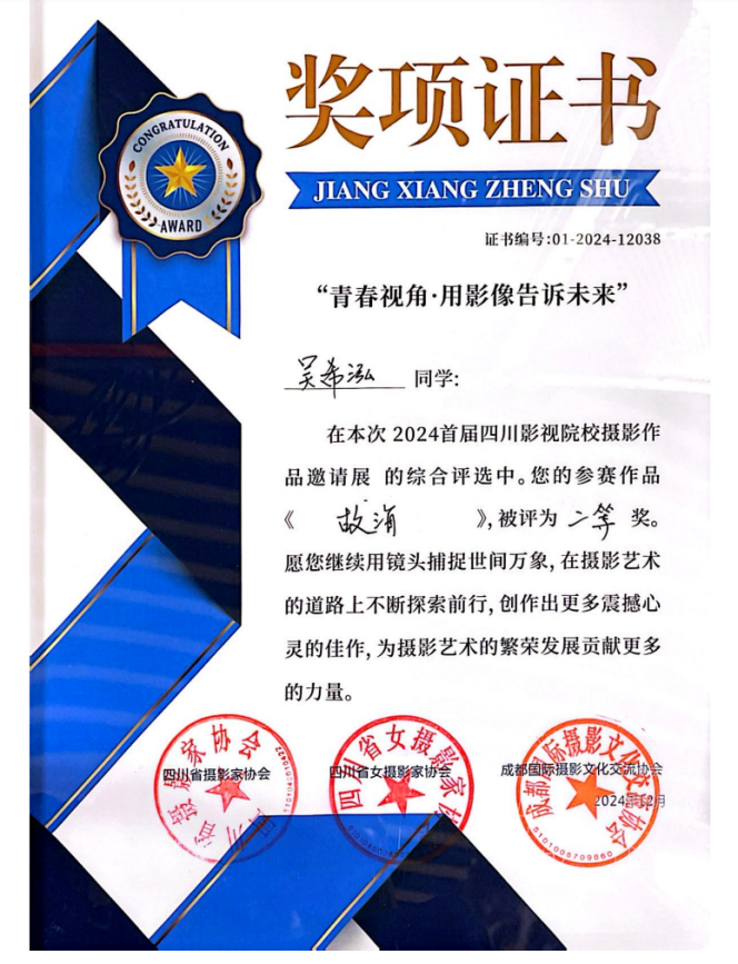 四川传媒学院摄影学院的学子们更是成绩斐然,斩获颇丰。在“青春视角 用影像告诉未来”2024首届四川影视院校摄影作品邀请展中,吴希泓获得二等奖,李梦涵、刘贺滨获得三等奖,朱雨晨、戎义丞、冯智宇、姚凌昆、娄扬子芮获得优秀奖,充分展现了学生扎实的摄影功底与独特的艺术视角。