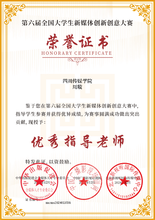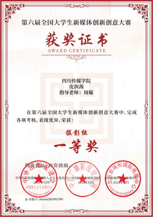 近日,2024年第六届全国大学生新媒体创新创意大赛圆满落幕,并正式揭晓了获奖名单。由我院广播电视编导专业周璇老师指导,2022级广播电视编导专业学生皮润茜创作的作品《上班,收到》获摄影组一等奖。周璇老师获优秀指导教师。