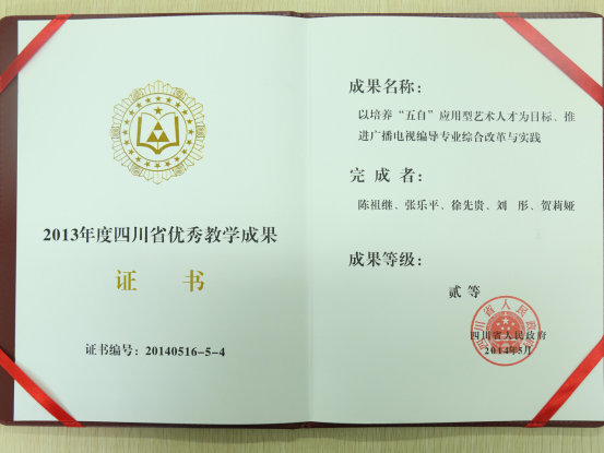 1、2014年,《以培养“五自”应用型人才为目标推进广播电视编导专业综合改革与实践》获第七届四川省教学成果奖二等奖