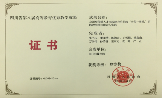 3、2018年,《应用型传媒人才实践能力培养的“全程一体化”实践教学模式探索与实践》获“四川省第八届教学成果奖三等奖”