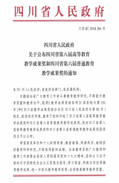 4、2018年,作为主要参与单位的《融合、贯通、升级——应用型传媒人才培养的探索与实践》获四川省第八届高等教育优秀教学成果奖一等奖