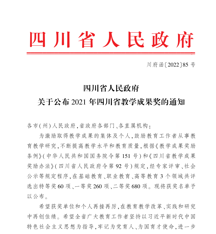 5、2022年,作为主要参与单位的《“园校合一,产教融合”——深化协同育人的“川传”探索与实践》获“四川省第九届教学成果奖二等奖”