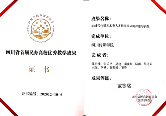 7、2020年,《新时代传媒艺术类人才培养模式的探索与实践》获四川省民办高校“教学成果奖”二等奖(本科)