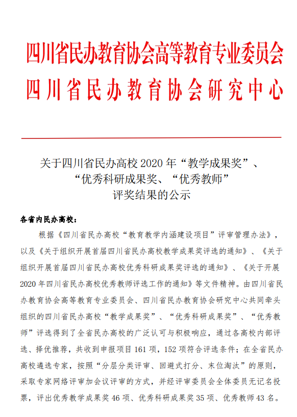 6、2020年,《适应智媒时代需求的应用型传媒人才创新创业能力培养的探索与实践》获“四川省民办高校2020年教学成果奖一等奖(本科)”