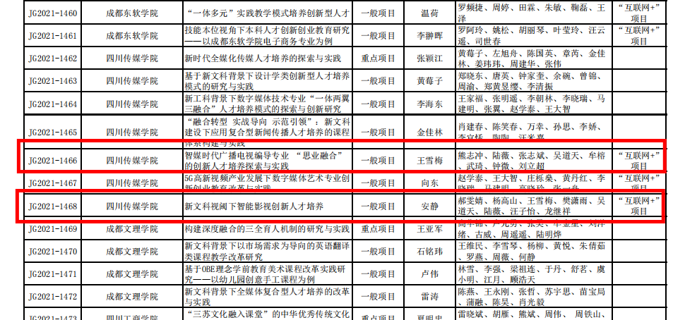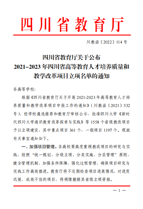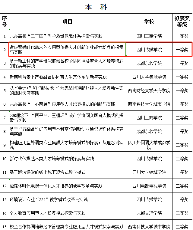 2、2022年,”智媒时代广播电视编导专业’思业融合’的创新人才培养探索与实践”获批“四川省教育厅2021-2023年高等教育人才培养质量和教学改革项目”(已结题)。