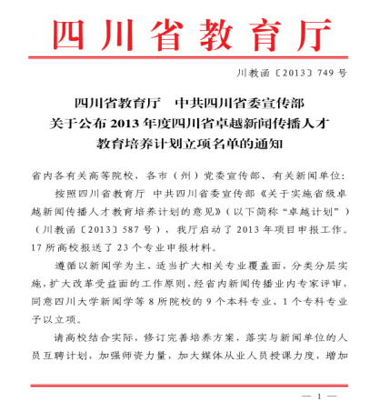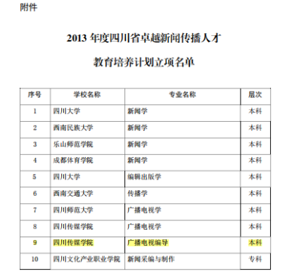 5、2013年,广播电视编导专业获批四川省卓越新闻传播人才培养计划试点专业
