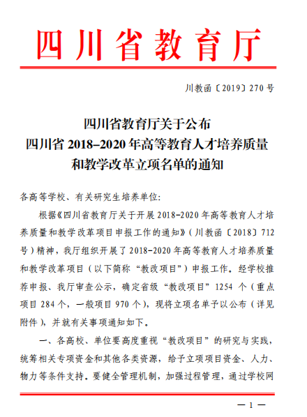 4、2019年,“新时代影视传媒艺术类人才培养模式的探索与实践”获批四川省2018-2020年高等教育人才培养质量和教学改革项目(已结题)