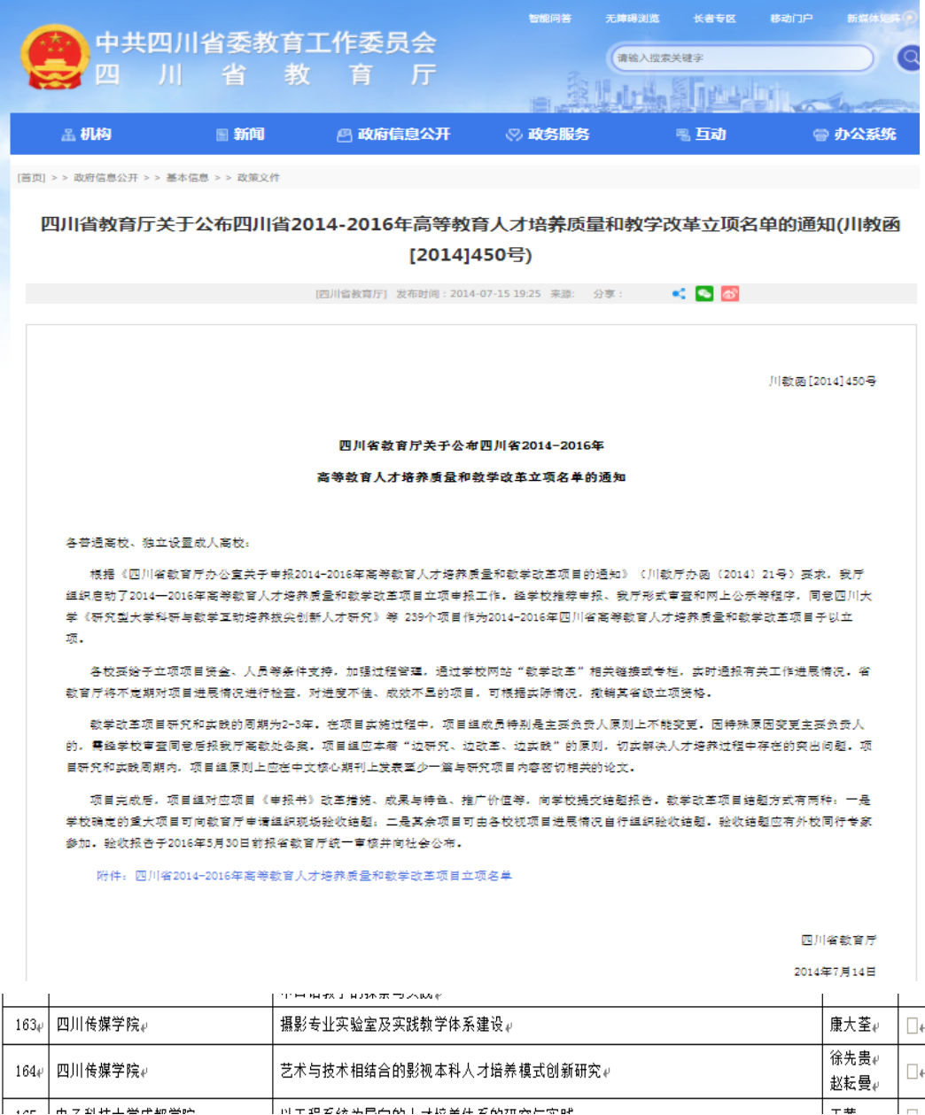 8、2014年,“艺术与科技相结合的影视本科人才培养模式创新研究”获批四川省2014-2016年高等教育人才培养质量和教学改革项目(已结题)