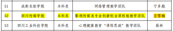 2021年,“影视传媒类专业创新创业课程组教学团队”获批四川省“课程思政”示范教学团队