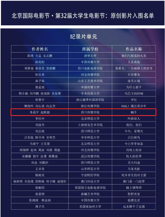 近日,北京国际电影节·第32届大学生电影节“国际大学生原创影片推选”入围名单公布。由四川传媒学院编导艺术学院教师刘蔚然、刘伟炜指导,2023级广播电视编导专业学生李晶宇、赵朕毅等创作的纪录片《蜗牛》入围纪录片单元。