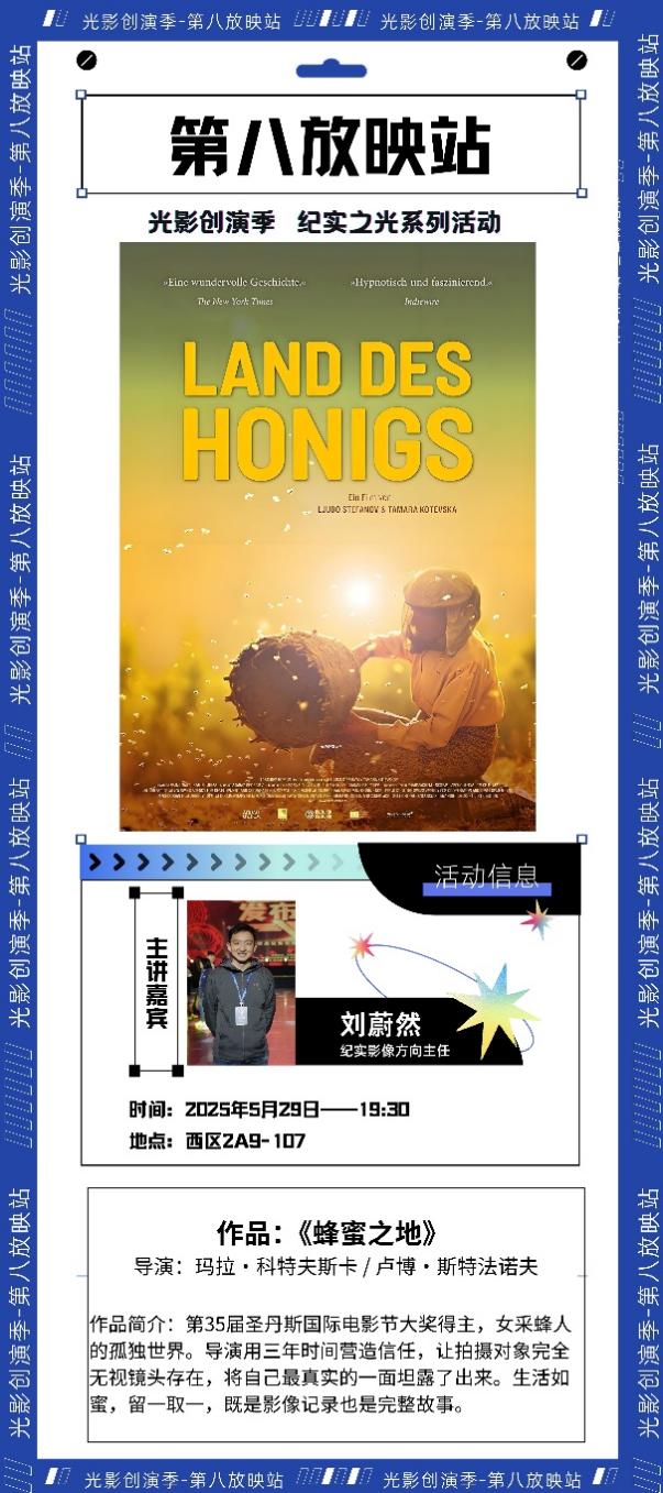 本次放映自5月27日启动,至今已放映三场。分别是纪录片《蜂蜜之地》《脸庞,村庄》《金的音像店》三部作品,分别由刘蔚然、周鸿宇、温德川老师放映与主讲。《蜂蜜之地》获得第35届圣丹斯国际电影节大奖,讲述了女采蜂人的孤独世界。导演塔玛拉·科特夫斯卡和卢博·斯特法诺夫用三年时间营造信任,让拍摄对象完全无视镜头存在,将自己最真实的一面坦露了出来。《脸庞,村庄》则是法国“新浪潮祖母”阿涅斯·瓦尔达的最后之作,讲述了瓦尔达与法国公共视觉艺术家JR打算拍一部电影,记录他们开着JR一辆能够即时成像的“拍立得”小货车,一路拍摄下所遇到的人物,并在当地的房子上、工厂墙上、集装箱等平面上张贴他们所拍摄的巨幅人物肖像。每场放映结束后,设置讨论环节,师生积极参与探讨纪录片主题相关知识。《金的音像店》聚焦一家被称为“影迷圣地”的传奇音像店,科恩兄弟也是它的常客。然而在音像店关闭后,拍摄者发现它的55000部影碟藏品不知所踪,继而引发一场疯狂热血的寻找与“营救”行动。