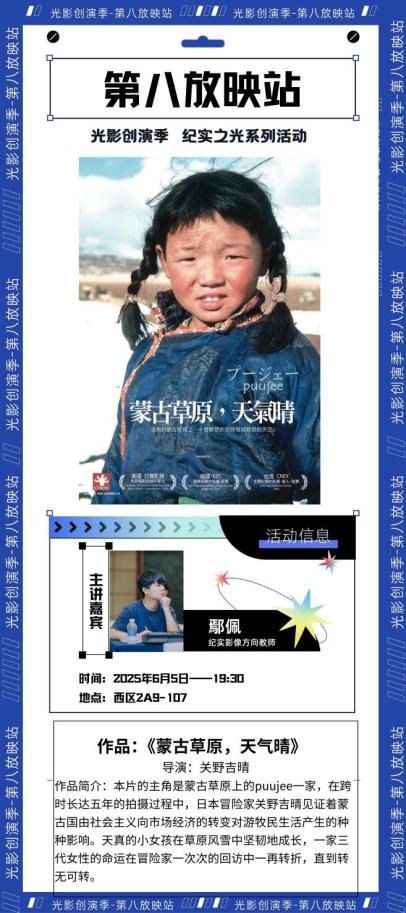 “第八放映站”作为四川传媒学院编导艺术学院2025年度光影创演季的活动之一,通过集中放映国内外关于自然科学、人文历史、社会现象等不同主题的优秀纪录片,帮助学生构建横跨多学科的知识网络,为专业学习奠定坚实的跨学科基础。6月5日,放映站将持续放映导演关野吉晴拍摄的《蒙古草原,天气晴》。编导艺术学院也将以光影创演季为契机,持续搭建学术交流平台,推动影视教育与时代同频共振。