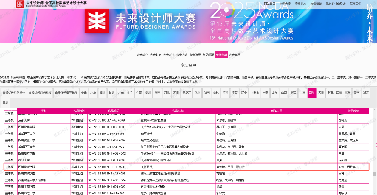 2025年8月9日,第十三届“未来设计师·全国高校数字艺术设计大赛”(NCDA)赛事省赛获奖名单正式公布。智能影像艺术学院2023级跨媒体艺术专业袁钟艳、王丹、胥心怡三位同学凭借AIGC角色设计系列作品《御五行》,在安静副教授与杨雅惠副教授的悉心指导下,荣获四川赛区三等奖,彰显了学院在“艺术+技术”融合教育领域的创新实践与育人成效。