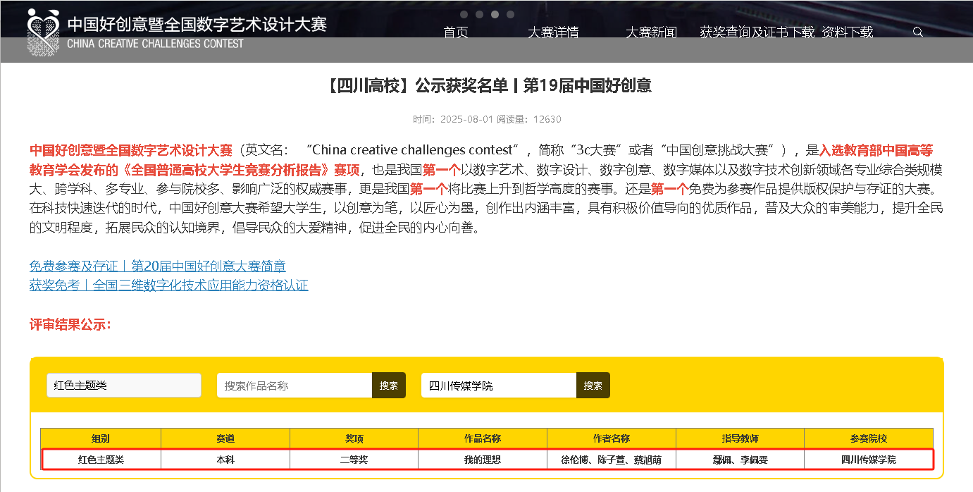 2025年8月,第19届中国好创意暨全国数字艺术设计大赛四川赛区公布获奖名单。由我院教师鄢佩老师、李佩雯老师联合指导, 2023级广播电视编导专业徐伦博、陈子萱、蔡旭萌三位同学联合创作的视频作品《我的理想》荣获二等奖;由杨雅惠老师指导,跨媒体艺术专业2023级学生李丹同学创作的设计作品《古韵巴蜀》荣获三等奖。