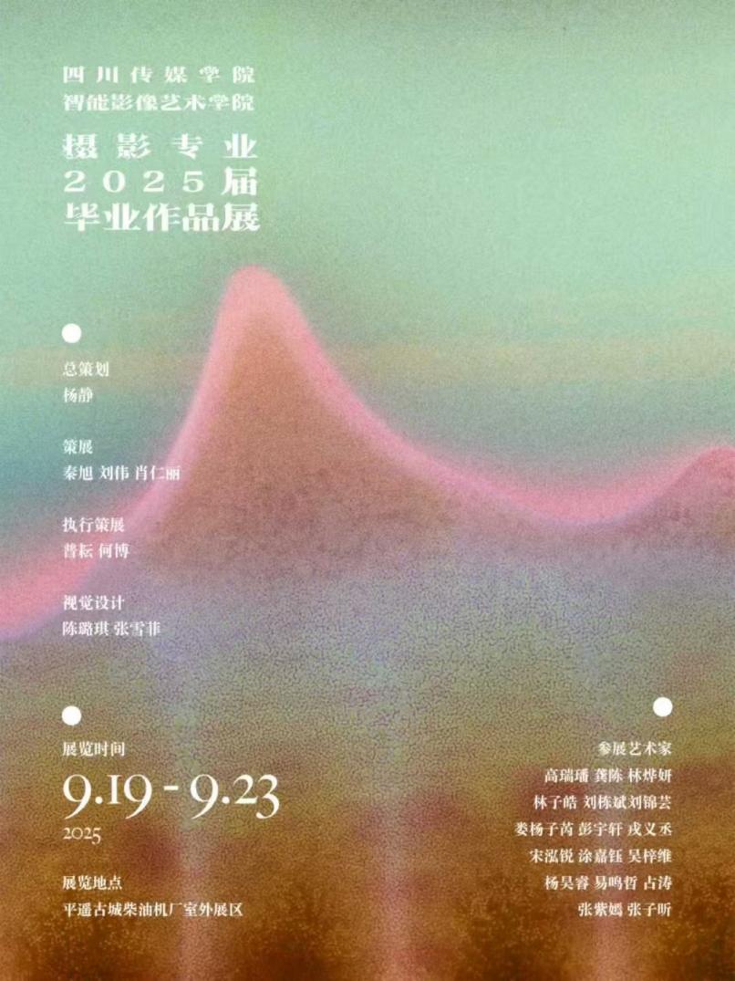 2025年9月19日至23日,四川传媒学院智能影像艺术学院摄影专业2025届毕业生的17组作品,亮相第25届平遥国际摄影大展。参展学生包括杨昊睿、张子昕、高瑞璠、龚陈、戎义丞、娄杨子芮、刘栋斌、易鸣哲、涂嘉钰、占涛、吴梓维、彭宇轩、宋泓锐、张紫嫣、林子皓、刘锦芸、林烨妍,共17位同学。展出的作品内容丰富,涉及对文化遗产传承的关注、对社会基层工作者的持续记录、对蜀地历史和现实的观照、对时尚影像的表达,同学们通过多元技术手段,讨论了影像本体、民族文化、城市空间与居住、个人历史等话题。