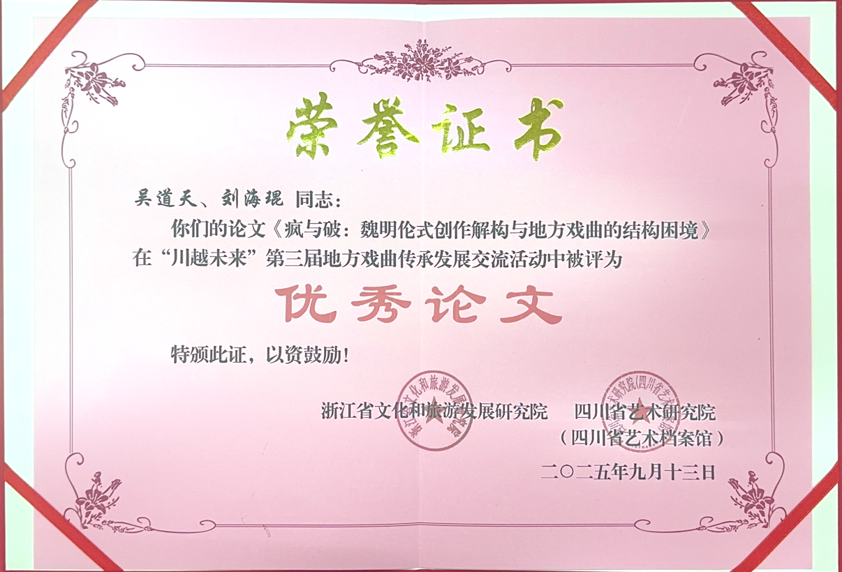 9月28日,全体教师参加了“川越未来”第三届地方戏曲传承发展交流活动。来自北京、上海、浙江、四川等地的专家学者,与黑龙江省艺术研究院、江苏省艺术研究院、河南省艺术研究院、重庆市文化和旅游研究院、四川省艺术研究院、浙江省文化和旅游发展研究院联盟成员单位代表,齐聚一堂,共商共谋地方戏曲发展新路径。同时,活动现场宣布了优秀论文名单,并为其颁发获奖证书。四川传媒学院智能影像艺术学院教师吴道天、刘海琨的论文《疯与破:魏明伦式创作解构与地方戏曲的结构困境》获“优秀论文”。