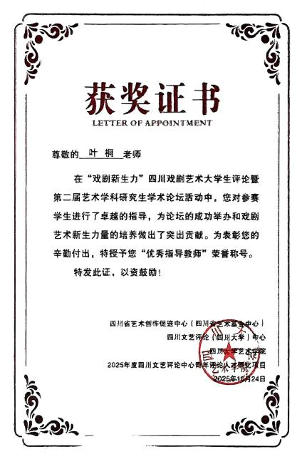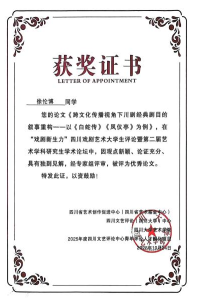 2025年10月24日,由四川文艺评论(四川大学)中心和四川大学艺术学院联合承办,成都市戏剧家协会和《现代艺术》杂志社协办的“戏剧新生力” 四川戏剧艺术大学生评论暨第二届艺术学科研究生学术论坛在四川大学艺术学院隆重举行。本次论坛规模盛大,共收到87篇论文,吸引来自中国传媒大学、中国艺术研究院、中央戏剧学院、上海戏剧学院等国内46所高校的青年学子参与。由智能影像艺术学院广播电视编导专业教师叶桐老师指导,2023级广播电视编导专业学生徐伦博撰写的论文入选本次学术论坛,并受邀现场宣读论文,更获评“优秀论文”。叶桐老师荣膺“优秀指导教师”称号。