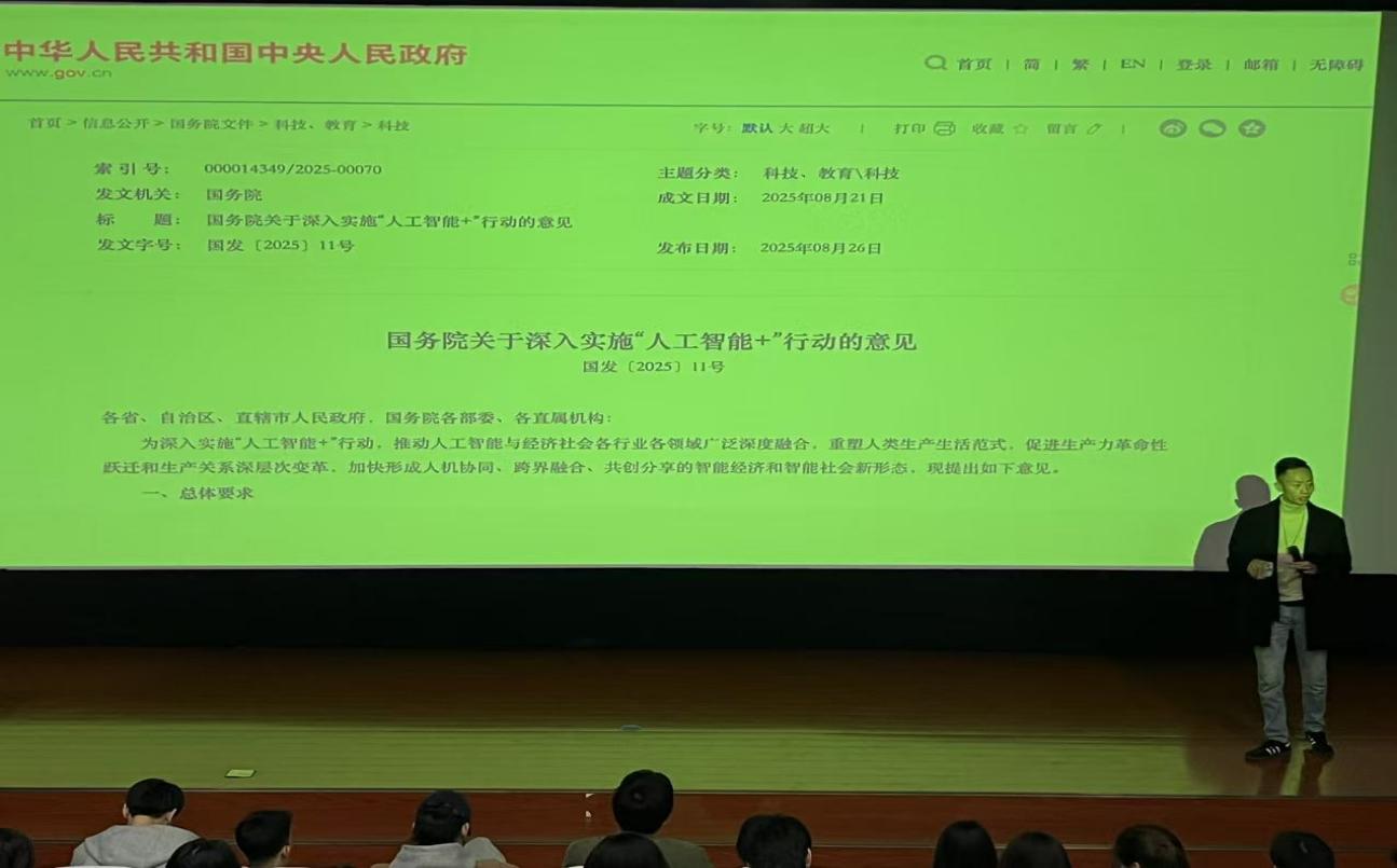 在宣讲会现场,心视觉传媒公司线上教育负责人田远岸以一系列富有启发性的问题为导向,详细阐述了AI行业的现状与未来发展潜力。他通过探讨三个核心问题,帮助同学们全面了解这一行业的广阔前景和个人职业发展的潜力。他首先讨论了“要不要进入AI行业?” AI行业作为国家政策支持的朝阳产业,发展前景广阔,正成为推动各行各业数字化转型的核心力量。根据2025年8月26日中华人民共和国中央人民政府发布的《国务院关于深入实施“人工智能+”行动的意见》,AI行业已经被纳入国家重点发展的战略产业领域,具有深远的社会影响力与市场需求。无论是科技创新,还是产业应用,AI行业都具备了巨大的发展潜力,为未来从业者提供了广阔的空间和机会。