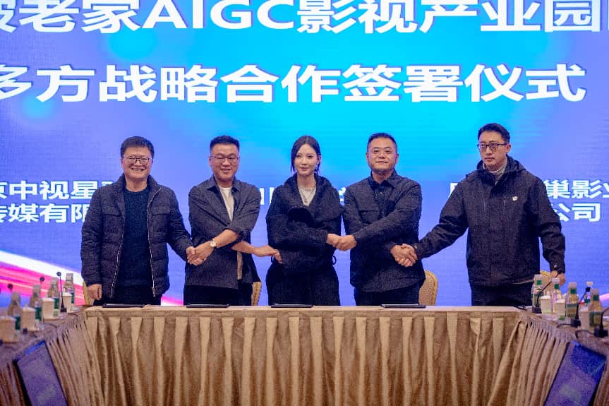 在热烈的掌声中,仪式完成了两项核心签约。首先,北京中视星驰文化传媒有限公司与我校学生双创企业成都零点沸腾科技有限公司签署战略合作框架协议,网络视听产业学院作为重要推动方与见证方共同参与。紧接着,举行了更具战略意义的眉山市东坡老家AIGC影视产业园五方合作签约。签约前,眉山东坡老家文旅投资有限公司董事长杜涛详细介绍了产业园依托东坡文化底蕴、打造数字文旅与AIGC影视制作高地的规划与愿景。而后,眉山东坡老家文旅投资有限公司、四川传媒学院网络视听产业学院、北京中视星驰文化传媒有限公司、成都喜巢影业有限公司、成都零点沸腾科技有限公司五方代表共同落笔,正式启动共建AIGC影视产业园区的深度合作。