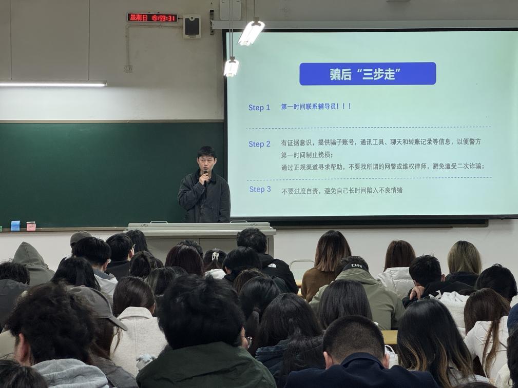 在班会上,我院辅导员着重强调了校园防电信诈骗教育的重要性,结合PPT讲解电信网络诈骗相关知识,涵盖刷单返利、虚假网购、校园贷、冒充客服、冒充亲友老师等多种常见诈骗类型,拆解各类骗局的作案手法、话术陷阱及识别要点,为同学们敲响反诈警钟。