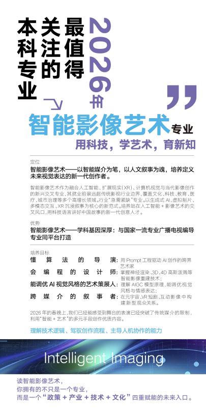 本专业立足人工智能和影像艺术的学科交叉前沿,面向国家文化数字化战略与全球数字创意产业变革,构建审美素养、技术思维和创作实践三维一体的人才培养体系,致力于培养兼具人文底蕴与智能素养的新一代复合型影像创作者。专业着力塑造四类核心人才画像:懂算法的导演、会编程的设计师、能调优AI视觉风格的艺术策展人、全媒介的叙事者。