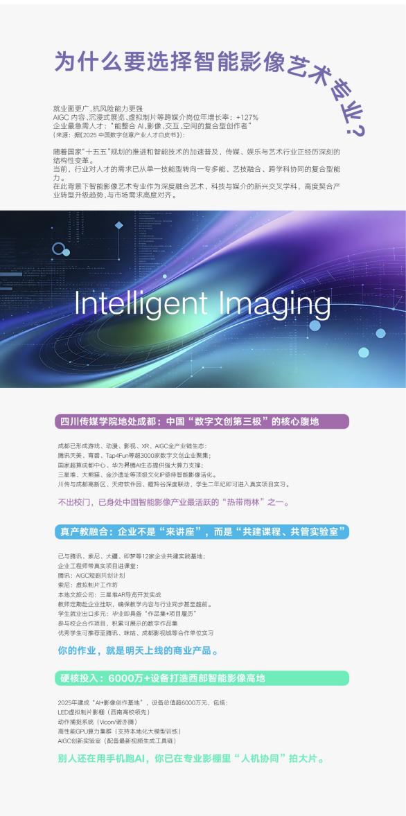 就业方向覆盖七大领域:AIGC内容生产,从事智能影像生成与虚拟人设计;XR与元宇宙开发,参与沉浸式体验与数字孪生项目;影视传媒行业,推动虚拟拍摄与智能后期技术升级;互联网平台,赋能短视频与内容智能化生产;文旅文博领域,服务数字文化遗产与智慧展陈;游戏与数字娱乐,参与虚拟角色与场景创作;教育与科研机构,持续推进学科前沿探索。